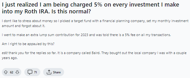 1/ Question: I just realized I am being charged 5% on every investment I make into my Roth IRA. Is this normal?